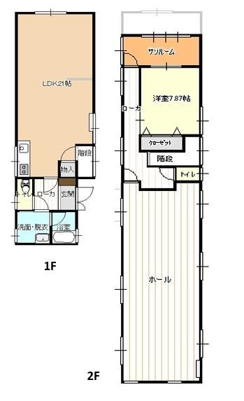 1階は21帖の広いLDKと水回りがあり、2階は広いホールがあります。トイレは1階と2階にあります。